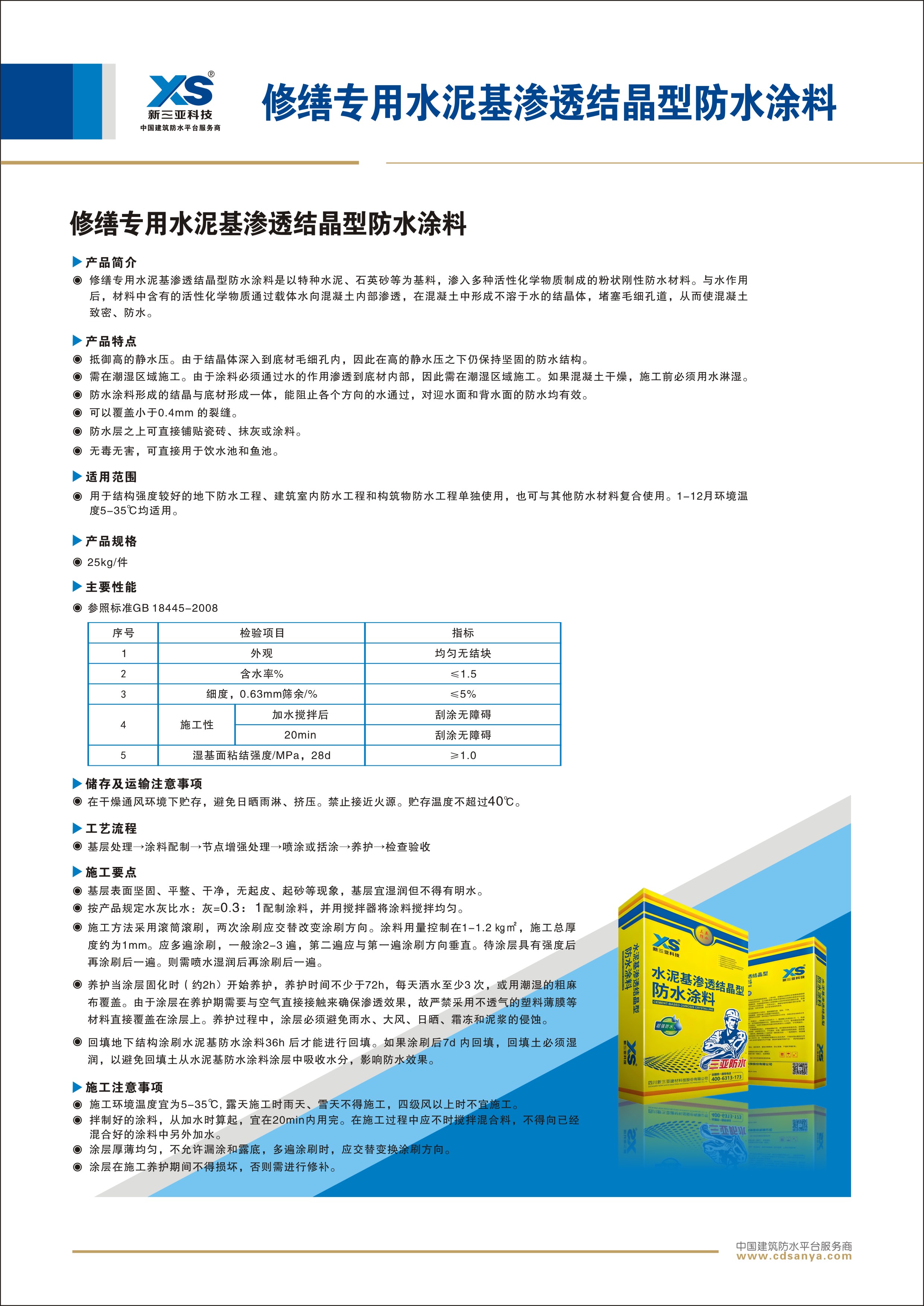 產(chǎn)品特點: 1.抵御高的靜水壓。 由于結(jié)晶體深入到底材毛細孔內(nèi), 因此在高的靜水壓之下仍保持堅固的防水結(jié)構(gòu)。 2.需在潮濕區(qū)域施工。 由于涂料必須通過水的作用滲透到底材內(nèi)部, 因此需在潮濕區(qū)域施工。 如果混凝土干燥, 施工前必須用水淋濕。 3.防水涂料形成的結(jié)晶與底材形成一體, 能阻止各個方向的水通過, 對迎水面和背水面的防水均有效。 4.可以覆蓋小于 0.4mm 的裂縫。 5.防水層之上可直接鋪貼瓷磚、 抹灰或涂料。 6.無毒無害,可直接用于飲水池和魚池。 參考用量:1mm:2~2.5kg/m 2(具體因基面粗糙度而定) | ![]() |