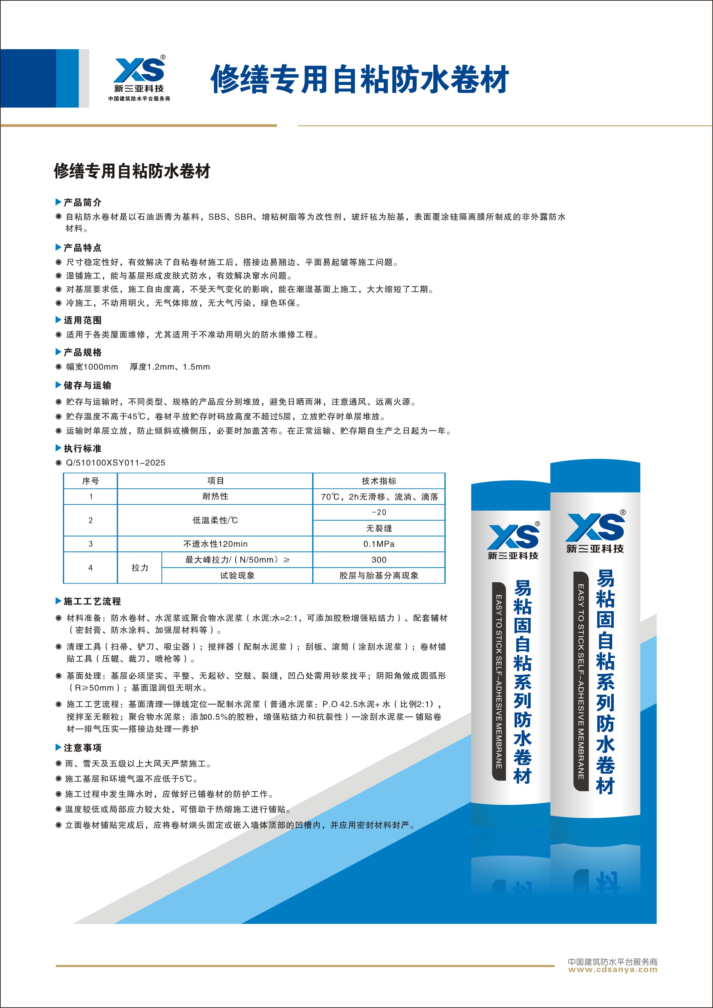 產(chǎn)品簡介 修繕專用自粘防水卷材是以石油瀝青為基料,SBS、SBR、增粘樹脂等為改性劑,玻纖氈為胎基,表面覆涂硅隔離膜所制成的非外露防水材料。 規(guī)格:1.2mm 1m×20m | ![]() |