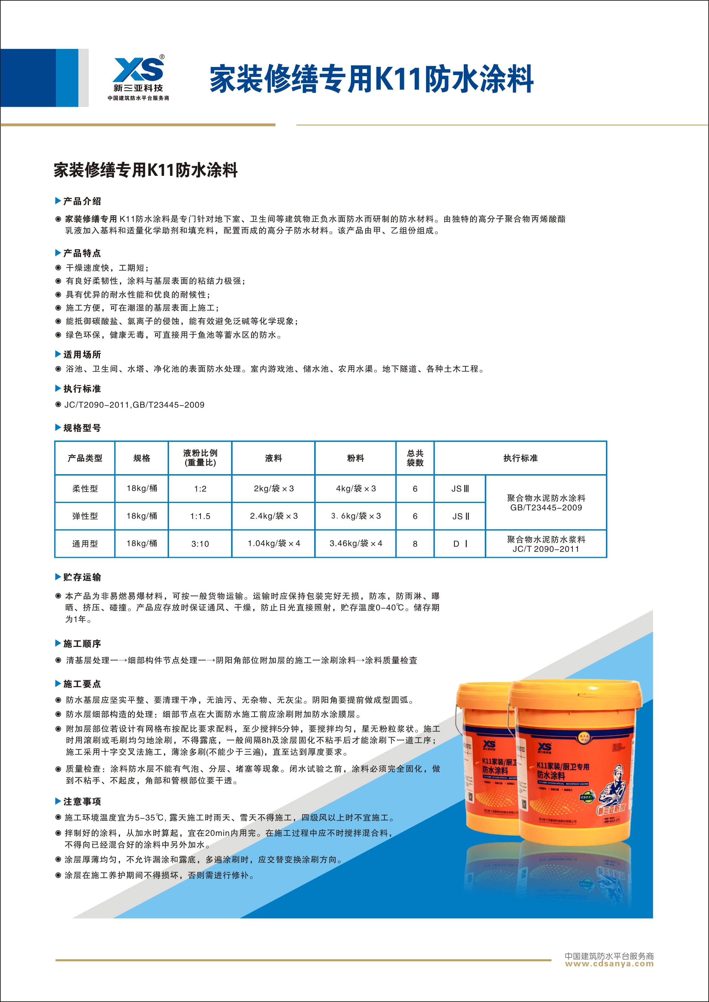 產(chǎn)品簡介: 家裝修繕專用K11防水涂料是專門針對地下室、衛(wèi)生間等建筑物正負水面防水而研制的防水材料。由獨特的高分子聚合物丙烯酸酯乳液加入基料和適量化學(xué)助劑和填充料,配置而成的高分子防水材料。該產(chǎn)品由甲、乙組份組成。 規(guī)格:18kg/桶 | ![]() |