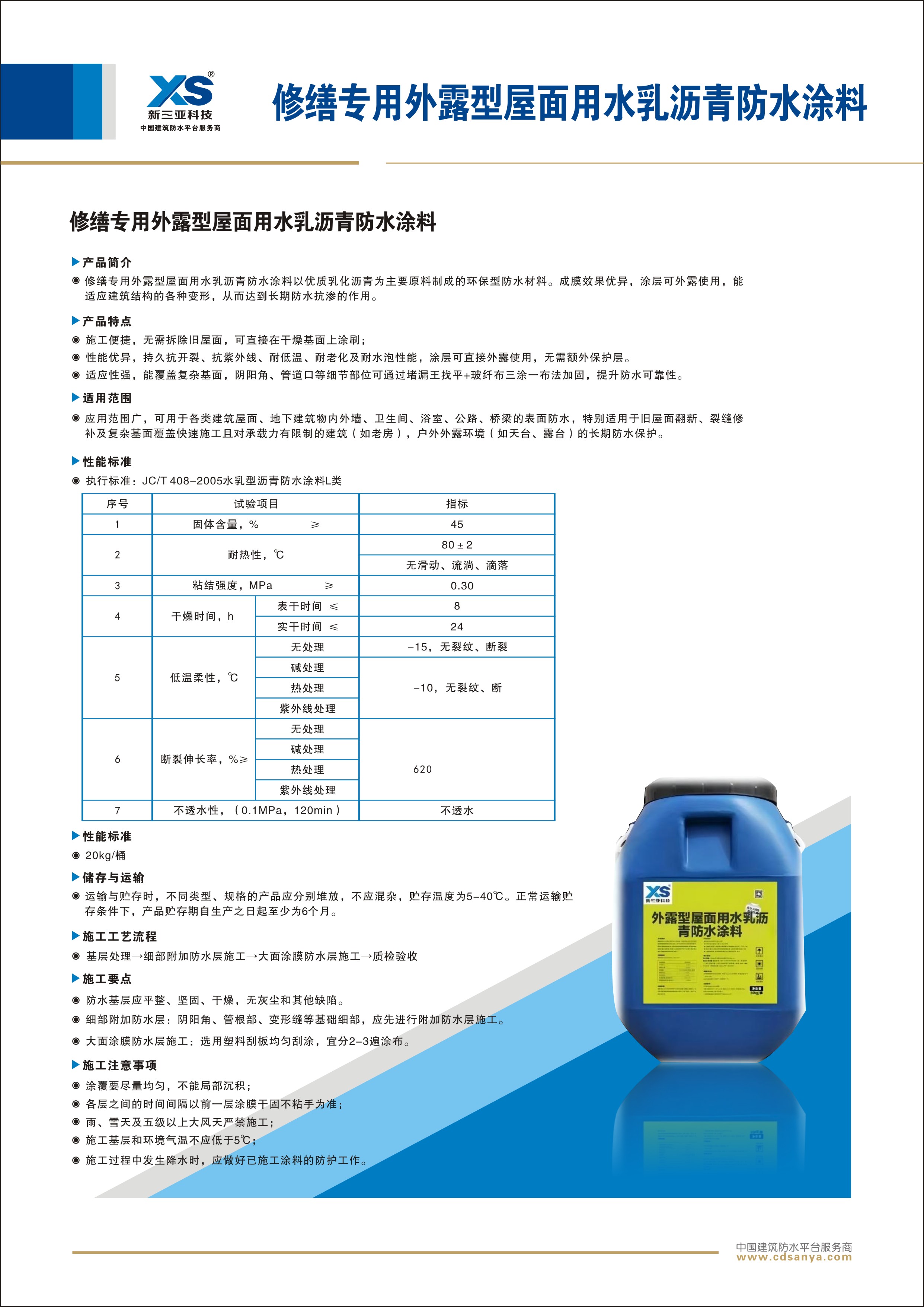 產(chǎn)品簡介: 修繕專用外露屋面用水乳瀝青防水涂料是以優(yōu)質(zhì)乳化瀝青為主要原料制成的環(huán)保型防水材料。成膜效果優(yōu)異,涂層可外露使用,能適應(yīng)建筑結(jié)構(gòu)的各種變形,從而達(dá)到長期防水抗?jié)B的作用。 規(guī)格:18kg/桶 | ![]() |