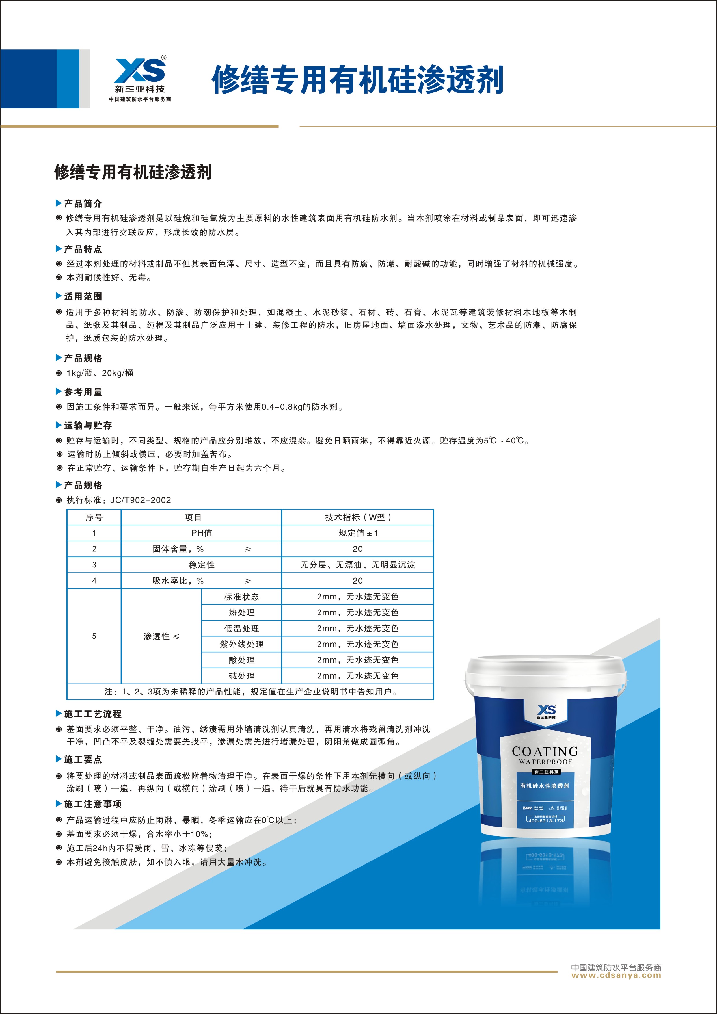 | 產(chǎn)品簡(jiǎn)介: 修繕專用有機(jī)硅滲透劑是以硅烷和硅氧烷為主要原料的水性建筑表面用有機(jī)硅防水劑。當(dāng)本劑噴涂在材料或制品表面,即可迅速滲入其內(nèi)部進(jìn)行交聯(lián)反應(yīng),形成長(zhǎng)效的防水層。 規(guī)格:5kg/桶
