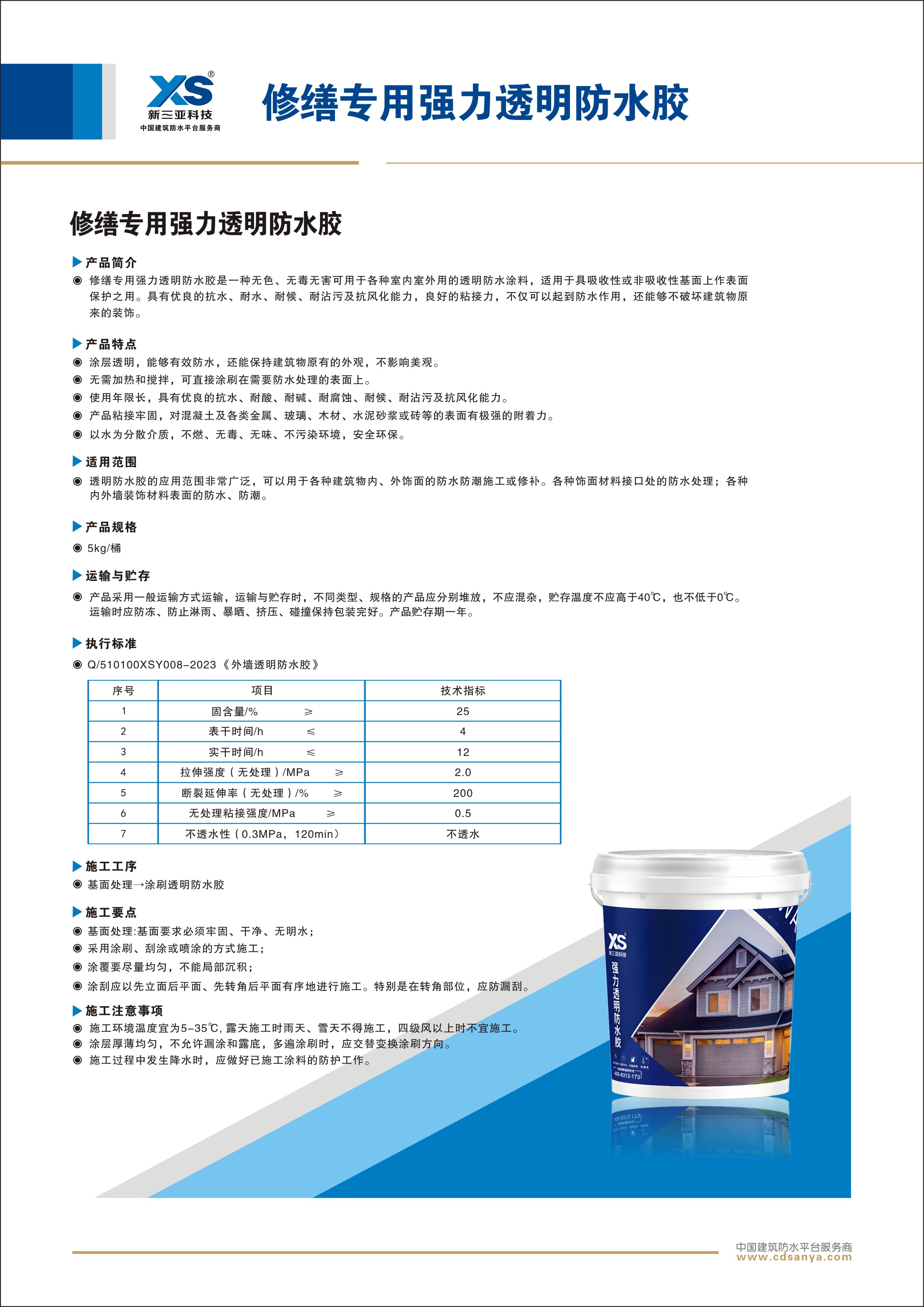 | 產(chǎn)品簡介: 修繕專用強(qiáng)力透明防水膠是一種無色、無毒無害可用于各種室內(nèi)室外用的透明防水涂料,適用于具吸收性或非吸收性基面上作表面保護(hù)之用。具有優(yōu)良的抗水、耐水、耐候、耐沾污及抗風(fēng)化能力,良好的粘接力,不僅可以起到防水作用,還能夠不破壞建筑物原來的裝飾。 規(guī)格:5kg/桶